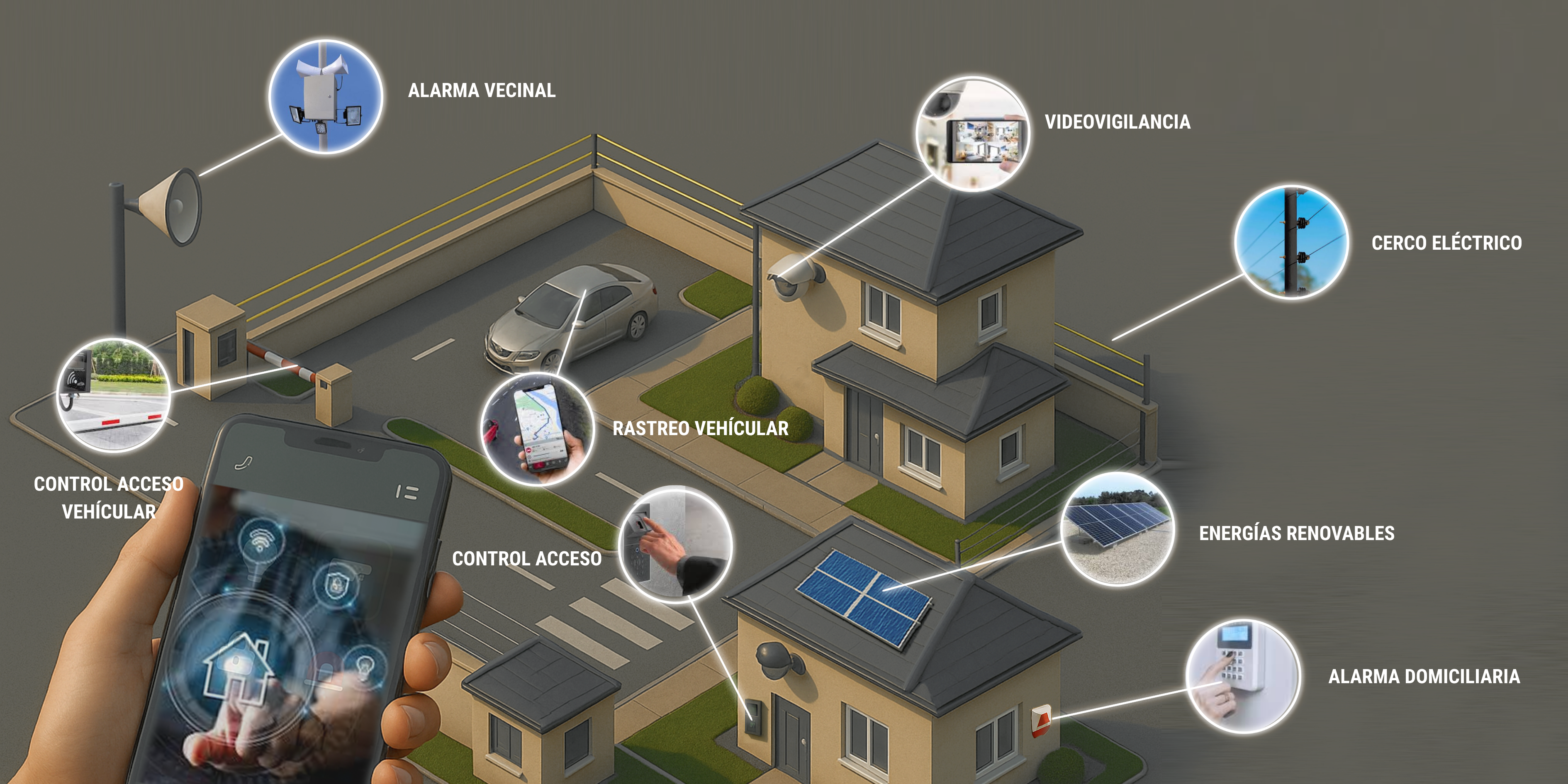 Cámaras, alarmas, monitoreo, control de accesos, detección temprana de incendios, cerco eléctrico, alarma vecinal.